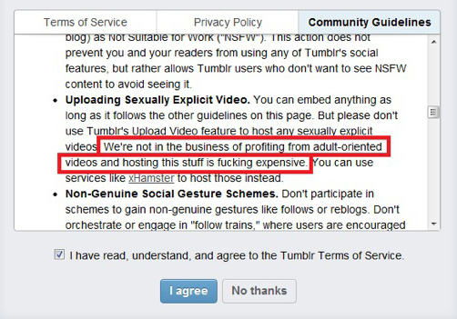 « Si vous avez moins de 13 ans, n’utilisez pas Tumblr. Demandez une Xbox à vos parents, ou testez les livres » ou encore  « Ne postez pas de photos privées de votre ex (peu importe si il/elle est séduisant(e) »